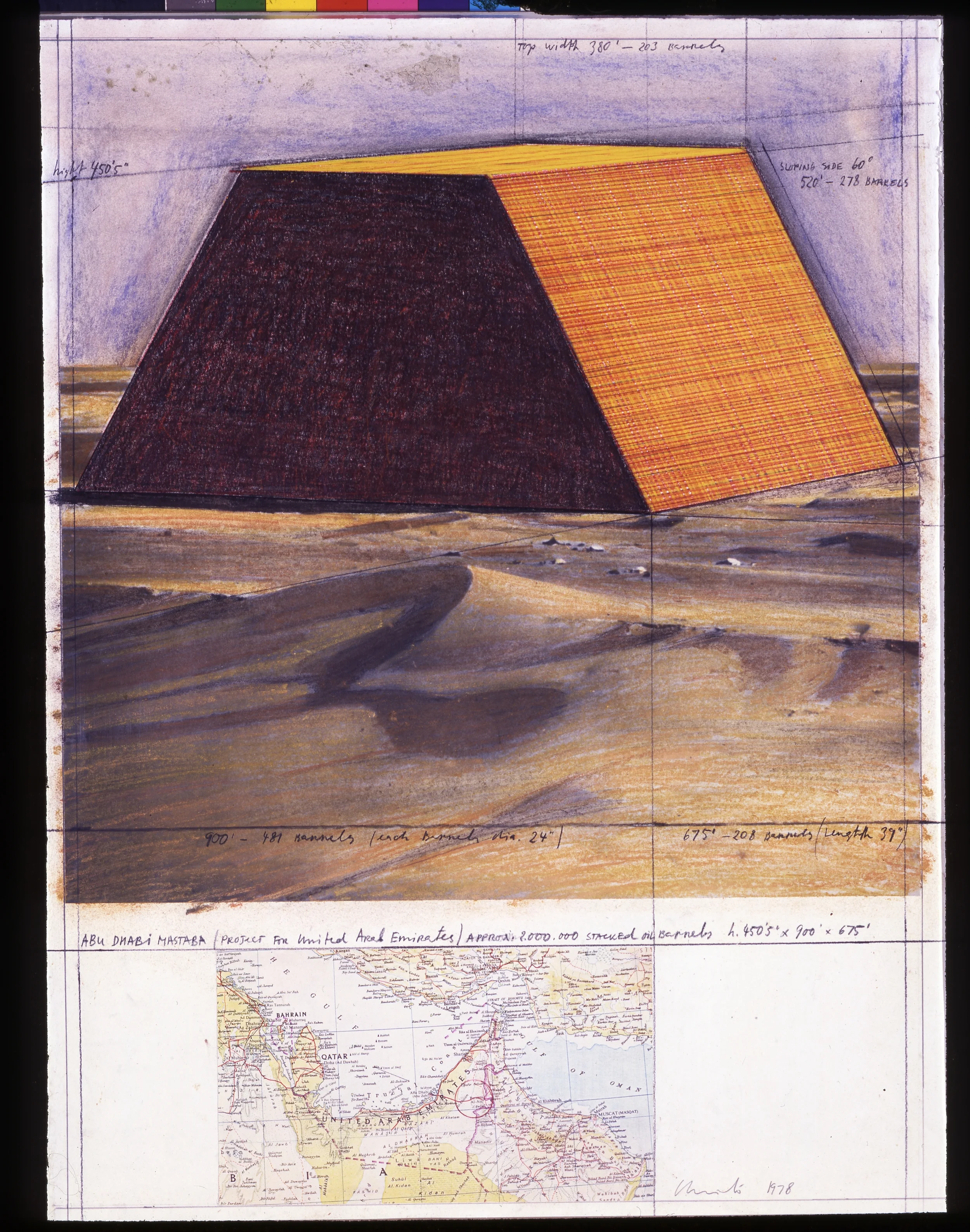 À la fin des années 1960, nous avons voulu implanter un mastaba au Texas, mais le projet a avorté, faute d’autorisations. Ensuite, nous avons voulu le réaliser en Hollande au début des années 1970. Finalement, nous promouvons le projet à Abou Dabi depuis 1973. Les dimensions de ce mastaba sont imposantes, car il doit faire 150 mètres de haut, 225 mètres de profondeur et 300 mètres de large (4 x 75 m) — une construction composée de 400.000 barils.