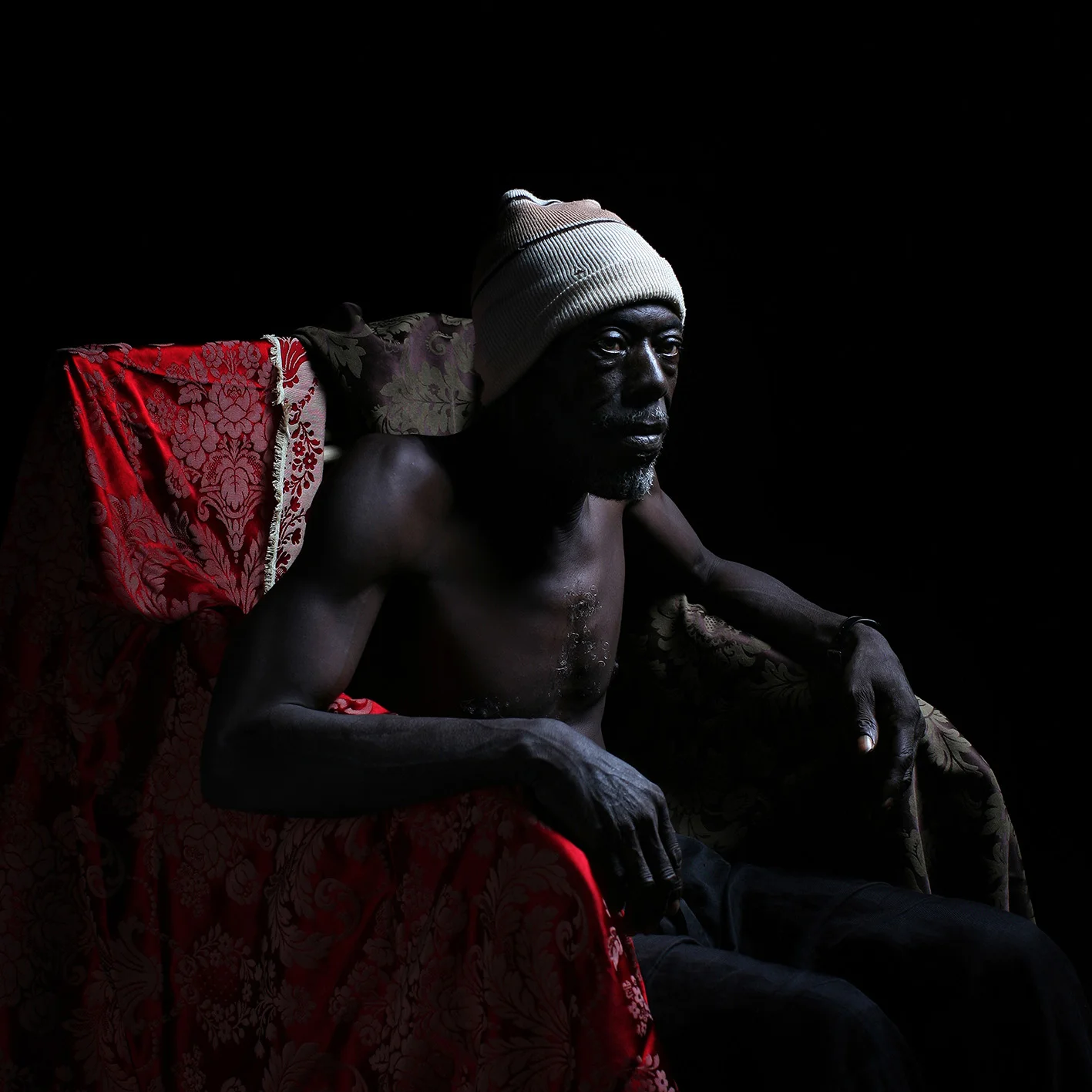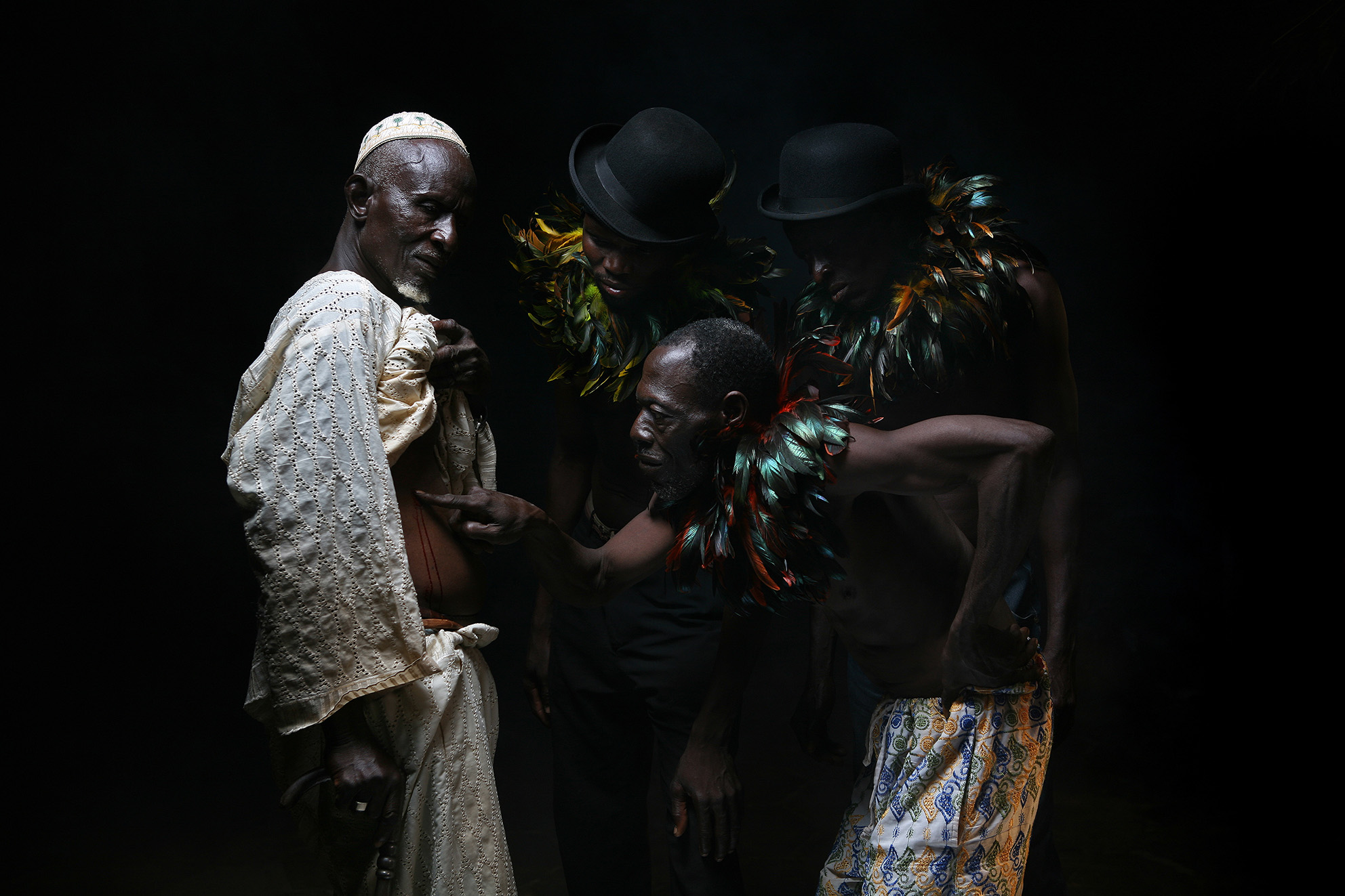 Dans la solitude des champs de coton (2016), œuvre-manifeste, incarne ce système Elle représente une scène étrange. Un vieil homme, qui émerge de la pénombre et relève une tunique blanche. Sur son abdomen, le sang a coulé d’une plaie que bouche un homme emplumé, en position d’auscultation, entouré par deux curieux, eux aussi emplumés. Instant figé, paroxystique, celui où le doigt entre en contact avec la plaie, d’une consultation mystérieuse, peut-être celle d’un médecine-man. Ou celle d’un sceptique ? La composition est inspirée de L’incrédulité de saint Thomas (1603) du Caravage. Sauf que les toges se transforment en tuniques. Sauf que le regard d’humilité souffreteuse du Christ et son geste — il tient la main de saint Thomas pour la rentrer dans la plaie — deviennent comme une posture de défi chez le sage africain. Chez Caravage, on lit la soumission du Christ à l’humilité et son essence divine transformée en chair abjecte. On aurait tôt fait de voir dans cette transposition un acte militant, un peu panafricaniste, comme une volonté de contrebalancer la domination esthétique, mythologique et historique de l’Occident sur les pays africains. On aurait tôt fait d’y voir une critique de la société postcoloniale, comme on peut le lire dans le monde de l’art quand il faut s’empresser de donner un « sujet » à une œuvre. On peut le faire, mais ce ne serait pas considérer le travail dans son entière complexité. Wahib Chehata ne dénonce rien, il énonce. L’histoire que conte cet homme christique ne se réduit pas à cela, surtout mise en perspective, dans son titre, avec la pièce de Bernard-Marie Koltès, un dialogue philosophique entre un dealer et son consommateur, où le dramaturge introduit avec une certaine radicalité l’idée du « deal » comme métaphore de tous les rapports humains. Le dealcomme matrice des rapports interindividuels d’un côté et de l’autre un geste purement impie, celui qui consiste à toucher (tâcher) ce qui est divin, à rompre le noli me tangere, c’est l’Afrique qui observe impuissante sa propre plaie en même temps que la mort de Dieu, le tout dans un faste baroque qui frise avec le ridicule. Des rapports de peur et de désir, de vie et de mort. Chez Bernard-Marie Koltès, on constate la même fascination que Wahib Chehata pour les formes classiques, celle de la tragédie pour le premier, de la peinture pour le second. Dans les deux cas, des œuvres éclatantes, mais qui se nourrissent des précédentes pour gagner en solennité, et porter le masque d’une irréalité emphatique, pathétique, et se parer en allégories.